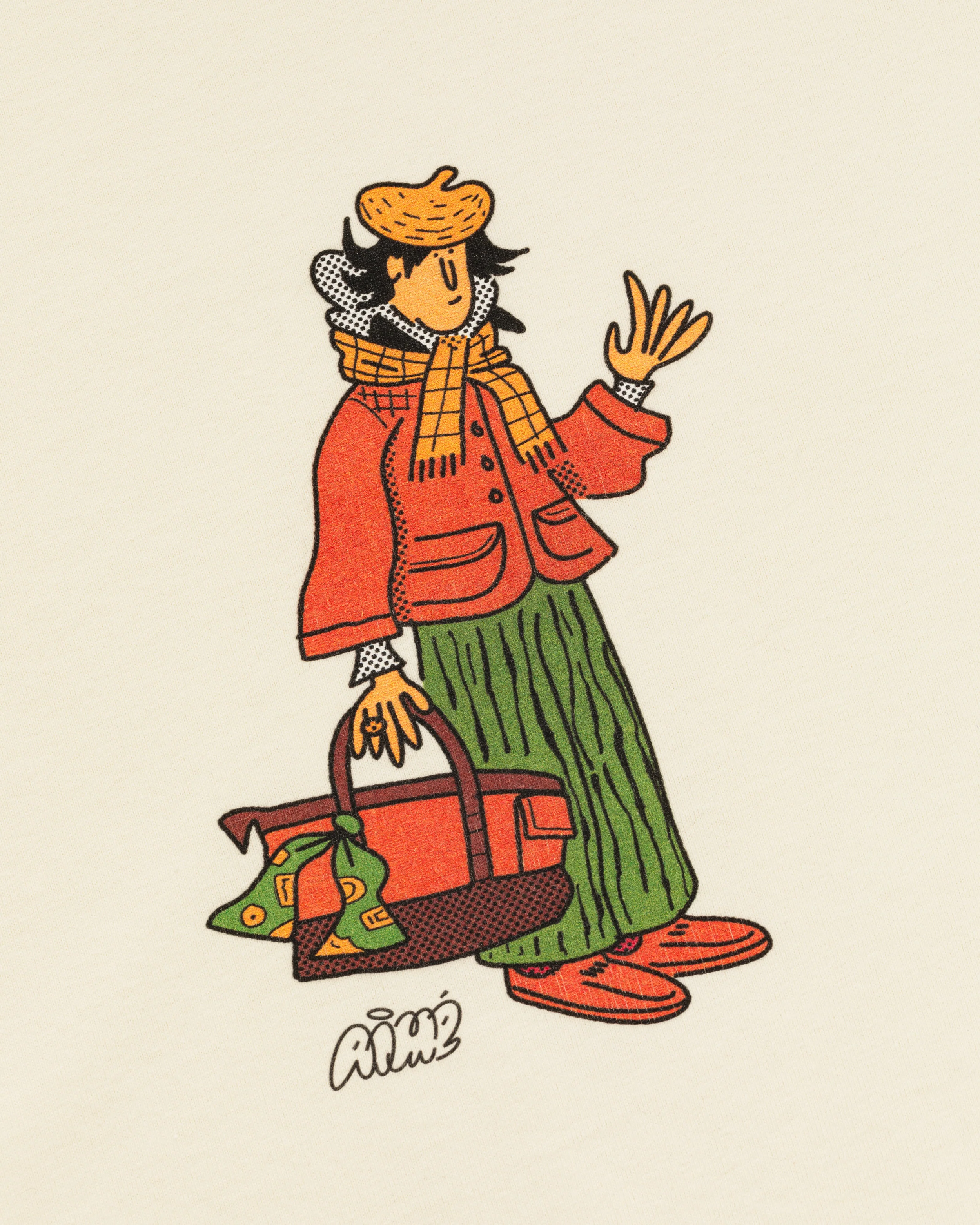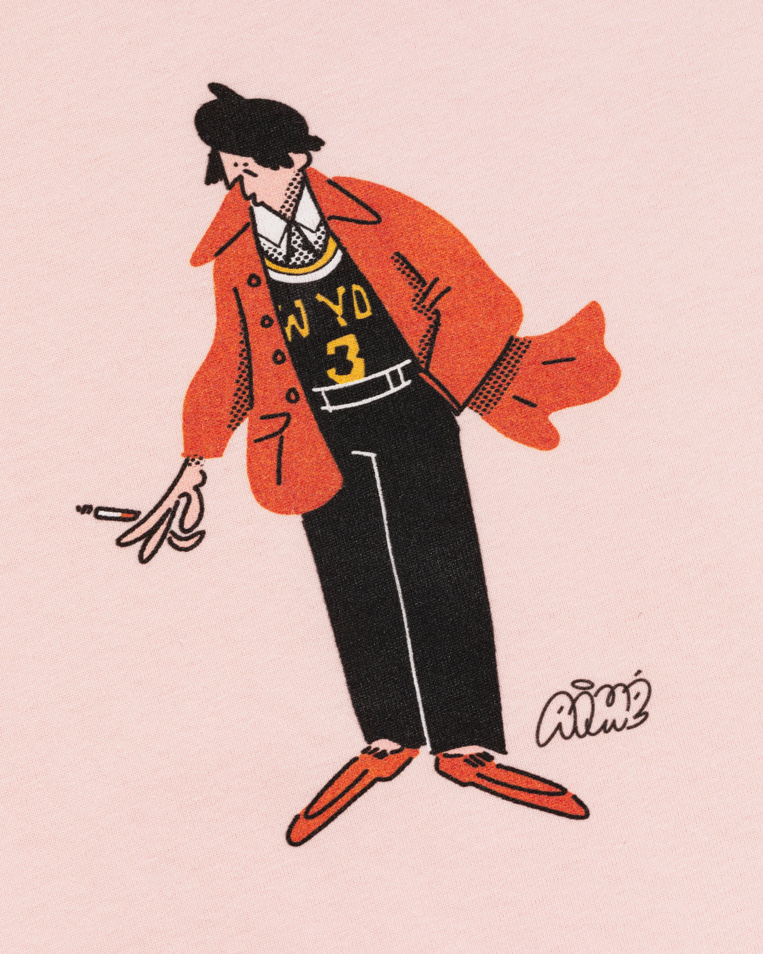 A selection of clothing designs created with Aimé Leon Dore, spanning graphic T-shirts and a knitted jumper. The illustrations were developed specifically for garments, balancing character-led artwork with wearability.